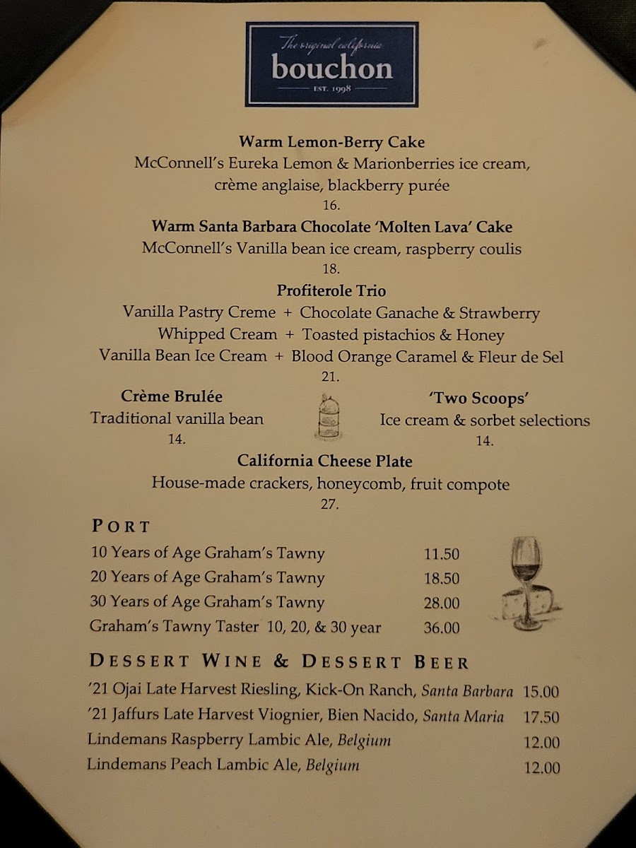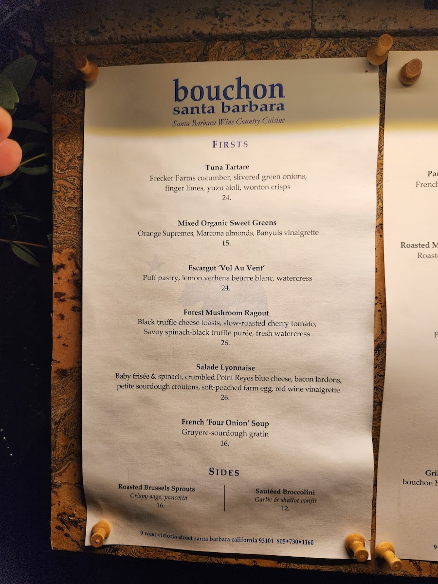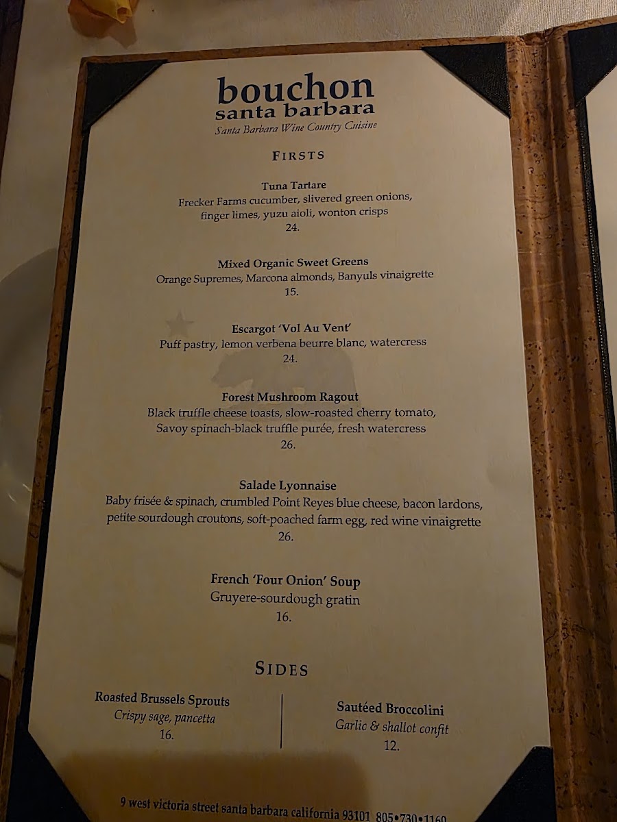 If you're looking for a dining experience that combines classic French cuisine with a cozy atmosphere, the Bouchon Santa Barbara Menu is the perfect place to explore. Located at 9 W Victoria St, Santa Barbara, this charming restaurant offers a range of delicious dishes that showcase the best of French-inspired flavors. From mouthwatering starters like fresh oysters and crisp salads to hearty mains such as tender steaks and flavorful seafood, there’s something to satisfy every craving. Pair your meal with a selection from their impressive wine list, and you’re in for a treat. Whether you’re here for a casual lunch or a romantic dinner, the menu offers a comforting yet refined dining experience, ideal for any occasion. With every dish thoughtfully crafted, Bouchon Santa Barbara brings a touch of elegance to Santa Barbara's dining scene.